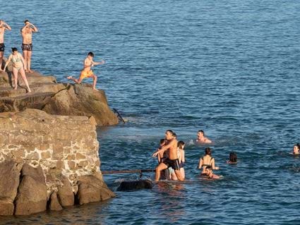An der Küste bei Sandycove schwimmen Einheimische und Touristen das ganze Jahr über im irischen Meer.14,7 km, 24 Minuten mit dem Zug