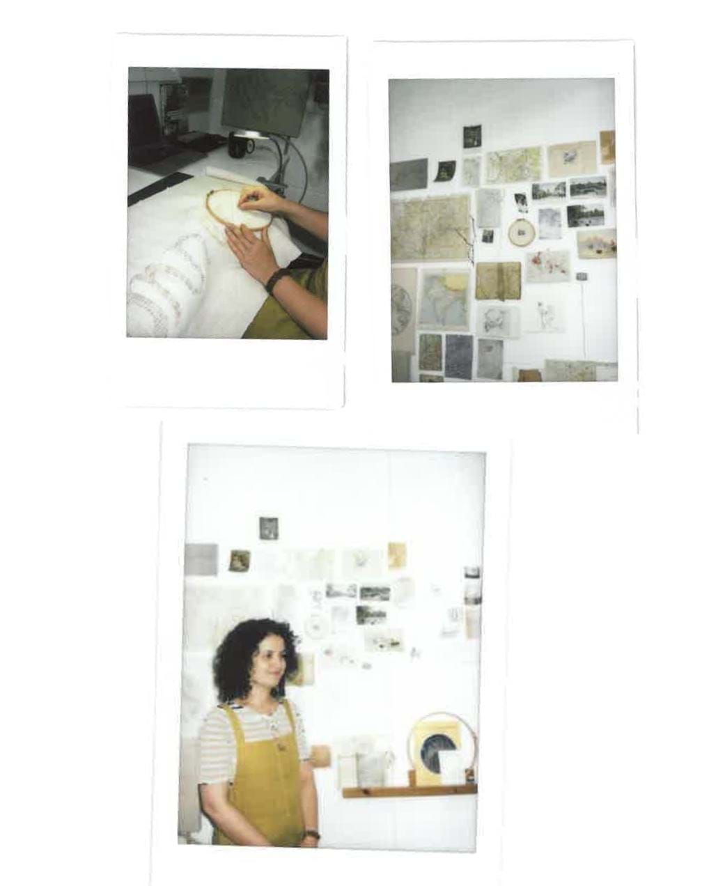„Meine gesammelten Materialien, alte Artefakte und der Gestaltungsprozess an sich sind immer meine direkte Inspirationsquelle. Ich erkunde Identität und ihre Vergänglichkeit, geprägt von aktuellen Ereignissen und meinem eigenen Leben. Dieses Thema hat meine bisherige Arbeit beeinflusst und inspiriert. Ich verwende alte Landkarten und schaffe daraus textile Kunstwerke, die abstrakte neue Landkarten darstellen. Damit erkunde ich die Bedeutung der Identität und bringe gleichzeitig ihre Vergänglichkeit zum Ausdruck.“