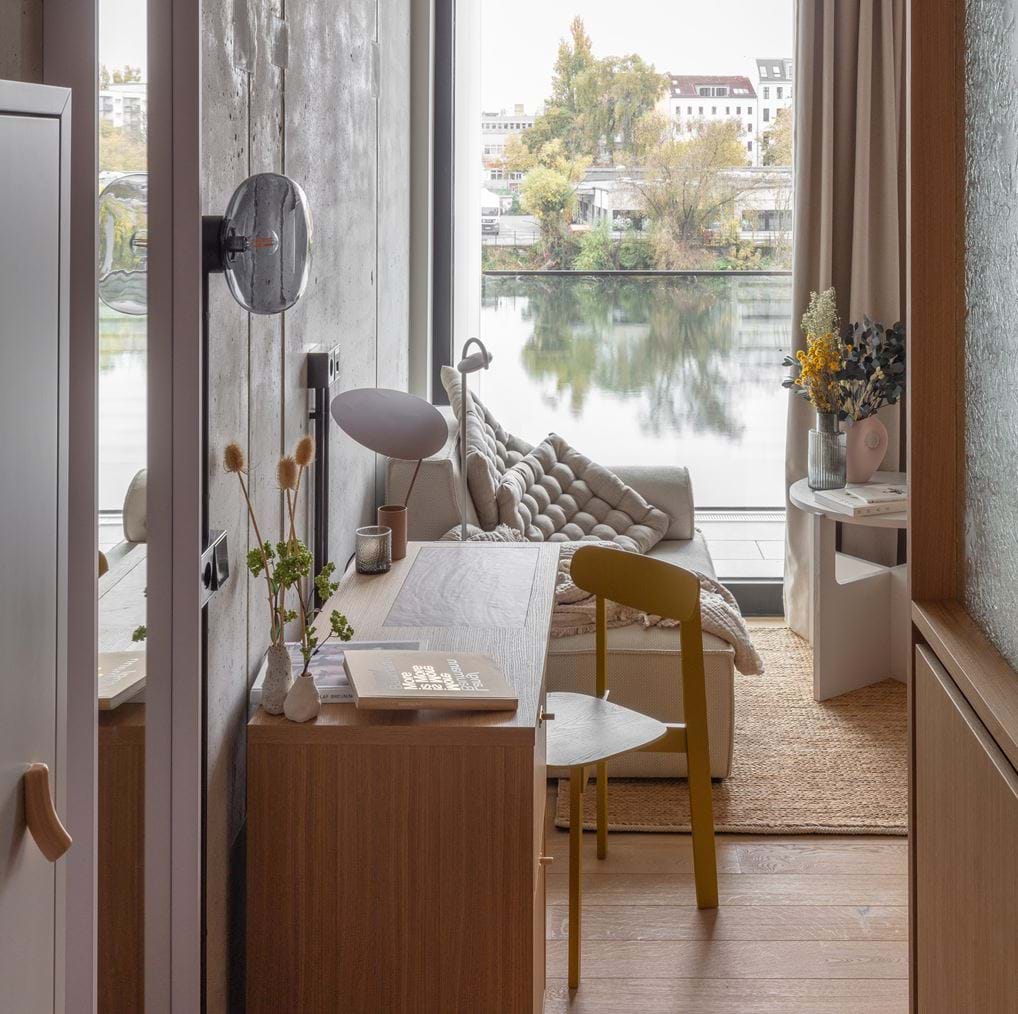 Designed by Matthew Grzywinski of Grzywinski+Pons, Locke at East Side Gallery takes its design cues from its surroundings – most notably the former Berlin Wall, River Spree, and neighbouring parks. Each apartment combines sophisticated neutral tones, natural textures, and raw concrete with pops of playful colour. Within the rooms themselves, walls are composed of timber panelling, with kiln-formed glass inspired by the surface of the Spree River acting as a partition to the bathroom. The furniture in the rooms exude warmth and texture with turmeric chairs, pastel mirrors and heavily braided grass rugs juxtaposed with suede and rattan floor screens and bedheads. The bathrooms feature back-painted black glass, walls and ceilings feature exposed structural concrete, softened with a powdery finish. Hand-scraped wood floors complement the aforementioned wall-as-threshold assembly of timber and textured glass. On the ground floor, social spaces comprising of the cafe, bar and restaurant, reception lounge and co-working spaces are connected with the use of non-continuous walls which in a nod to the vestiges of the Berliner Mauer are used as compositional elements, creating implicit “neighbourhoods” in the space. Built-in seating and planters are fabricated from locally-sourced bricks comprised of recycled sand and lime while furnishings follow a cohesive palette of timber, cane, fabric and cord, surrounded by verdant vegetation spilling out of planters and cascading from the ceiling.