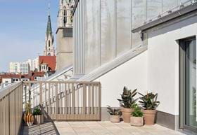 These stunning 32m² suites have a balcony overlooking the leafy internal courtyard, and a roomy, open-plan layout.